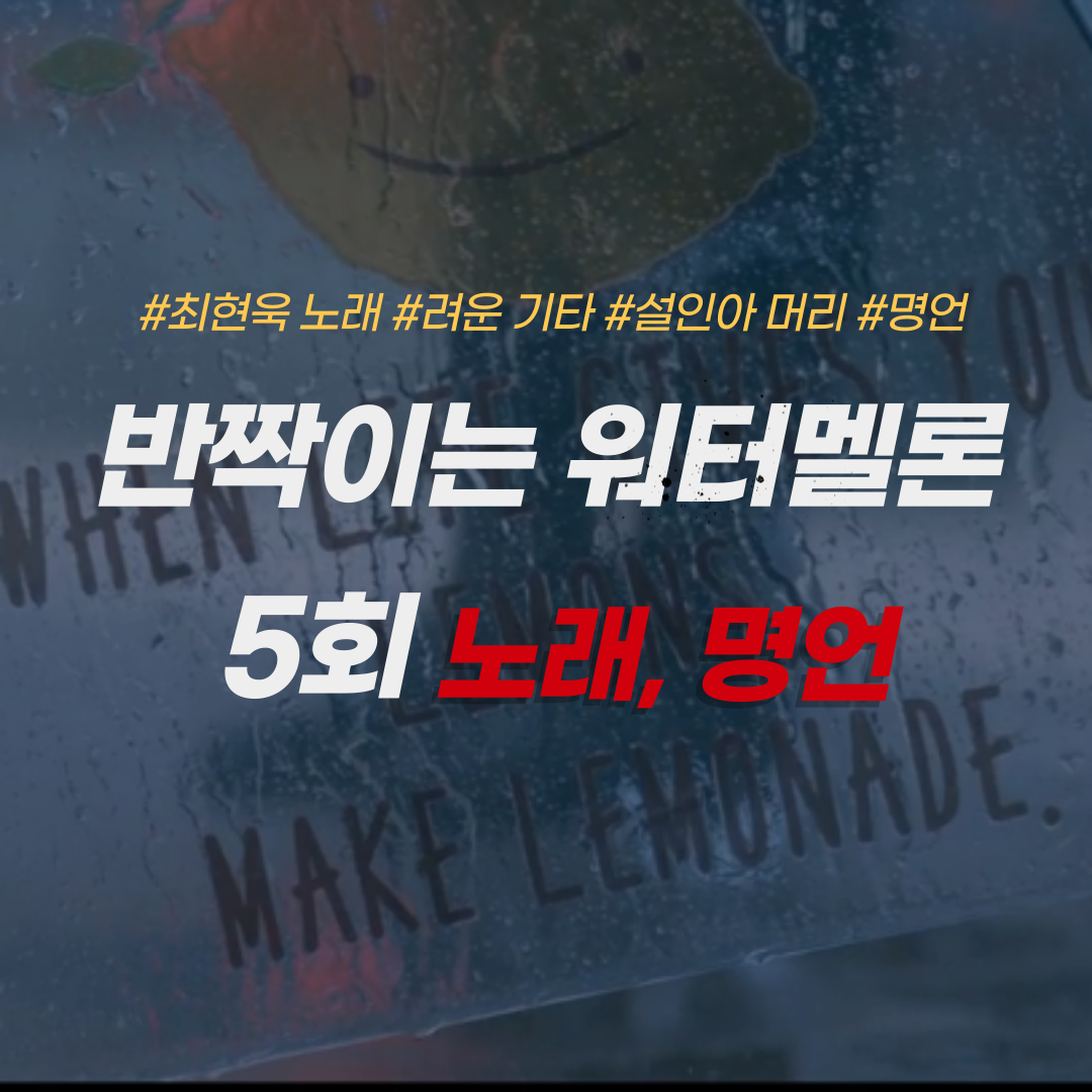 반짝이는 워터멜론 5회의 마지막 글귀는 세바시에서 지나영 교수가 인용했었던 명언이기도 한데요. "삶이 당신에게 레몬을 준다면 그것으로 레몬에이드를 만들어라" 라는 명언은 "지금의 상황을 만든 것은 내가 아닐 수도 있다. 하지만 이 또한 뜻이 있을 것이고, 나에게 주는 큰 가르침이 있을 것이다. 지금 이 시고 쓴 레몬은 나에게 안 좋은 일일 수 있지만, 나에게 단 레몬에이드로 만들어 이 상활을 극복해보자." 와 같은 의미를 담고 있는 명언입니다.