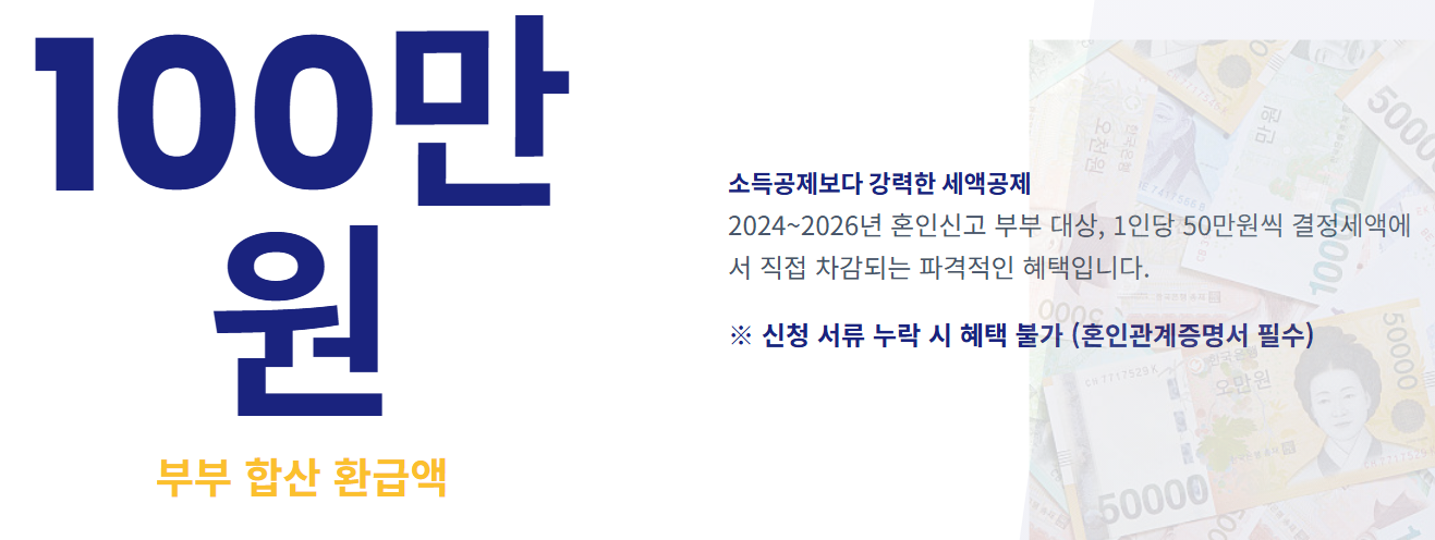 2024~2026년 혼인신고를 한 부부라면 1인당 50만 원, 부부 합산 총 100만 원을 내야 할 세금에서 직접 깎아줍니다. 소득공제보다 훨씬 강력한 혜택이니 절대 놓치지 마세요.