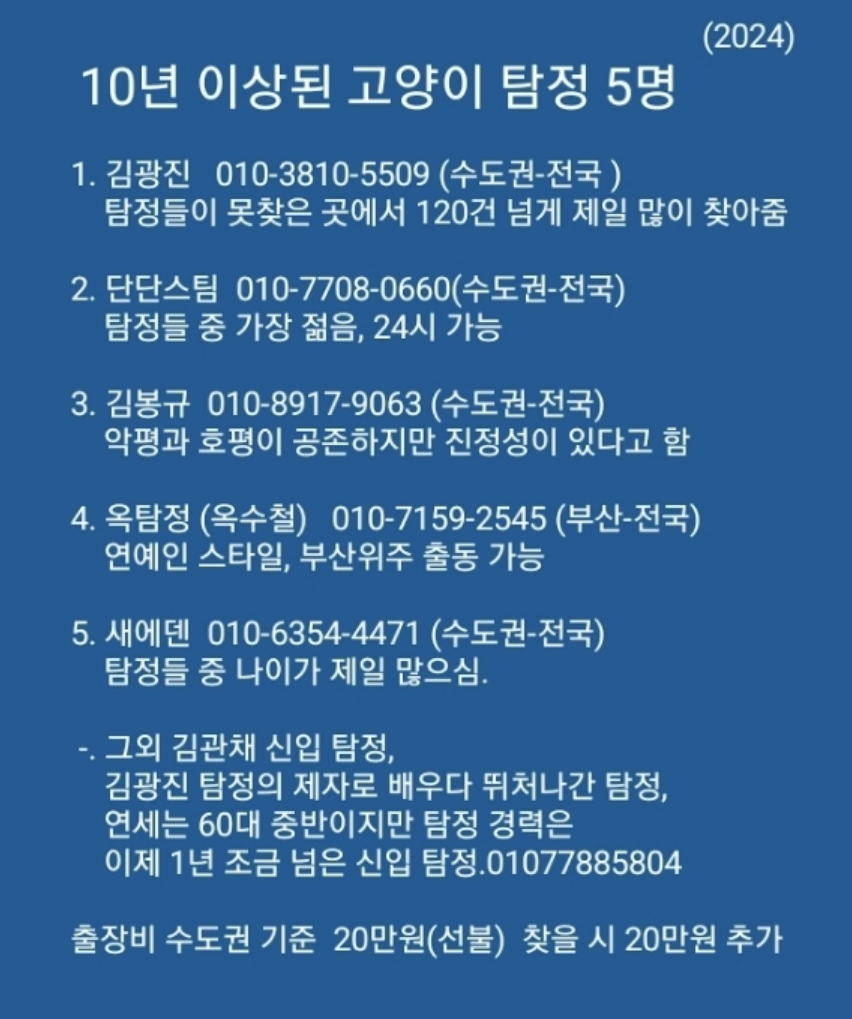 고양이 탐정은 잃어버린 고양이를 찾는 데 큰 도움을 줄 수 있는 전문가입니다. 고양이가 가출했을 때는 주저하지 말고 고양이 탐정에게 의뢰해 보세요. 사명감을 가지고 반려묘, 반려견을 키우시는 분들의 고민에 대한 전문적인 도움으로 소중한 가족을 다시 만날 수 있을 것입니다.