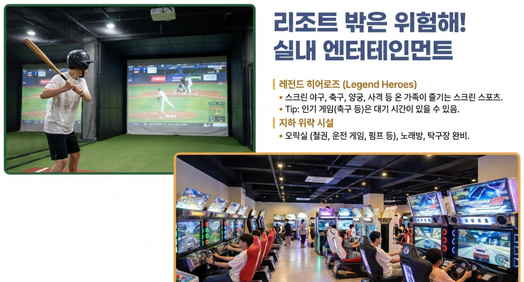 - 아이들의 천국: 수심이 얕은 키즈풀과 따뜻한 실내존 덕분에 감기 걱정 없이 아이들과 놀 수 있습니다.