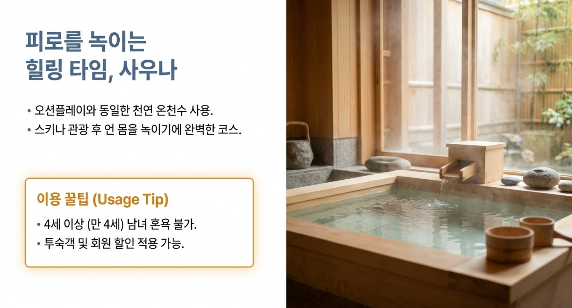 - 사우나 필수: 워터파크 이용 후 연결된 사우나는 꼭 들르세요. 노천탕에서 차가운 공기와 뜨거운 물을 동시에 즐기는 '노천욕'은 겨울 여행의 하이라이트입니다.