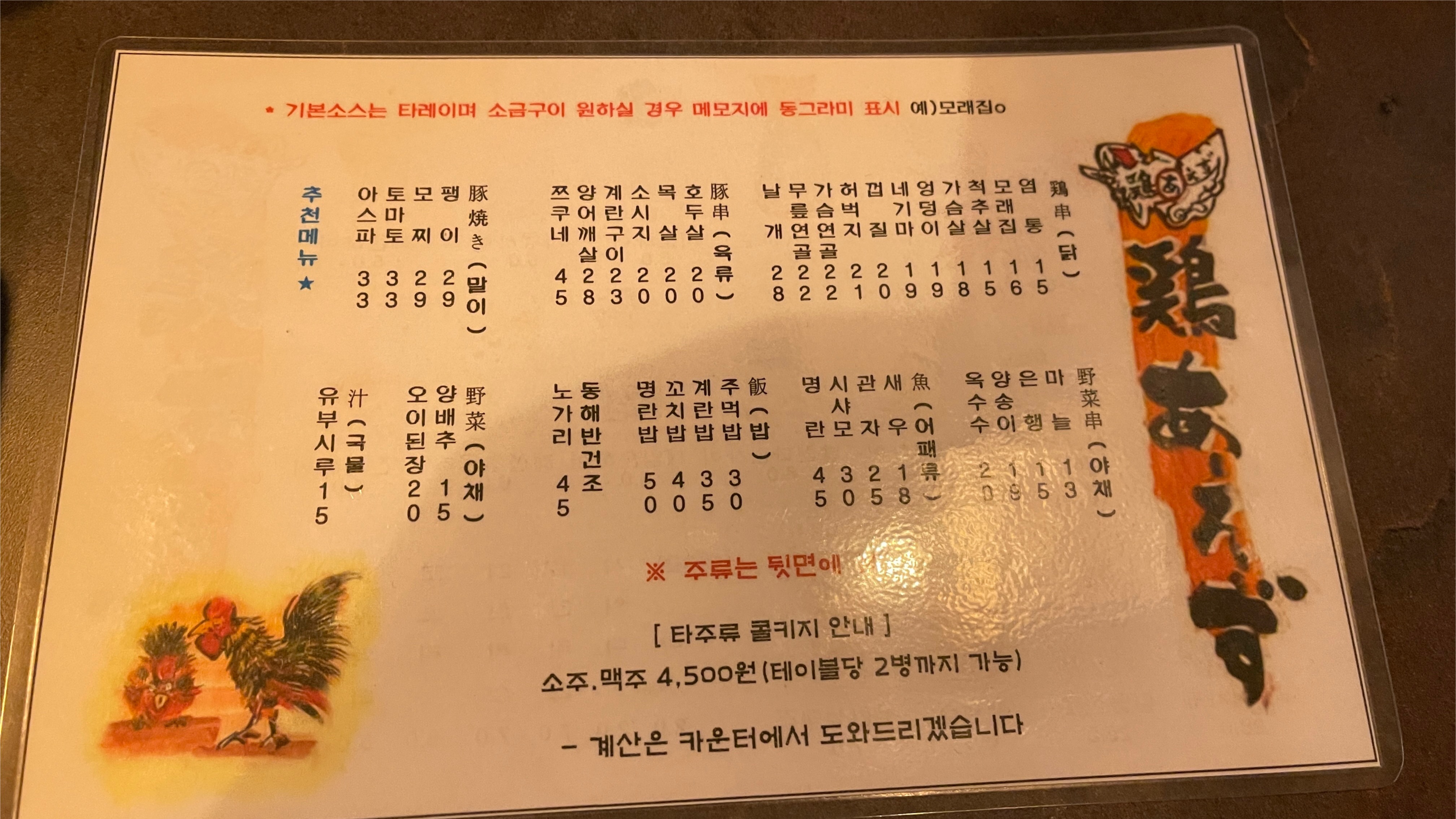 일단 내부는 매우 깔끔했어요. 바 테이블이 있었고, 꼬치 굽는 것을 구경할 수도 있는 인테리어. 그리고 테이블 자리도 있었는데, 저희는 테이블 자리에 자리했습니다.