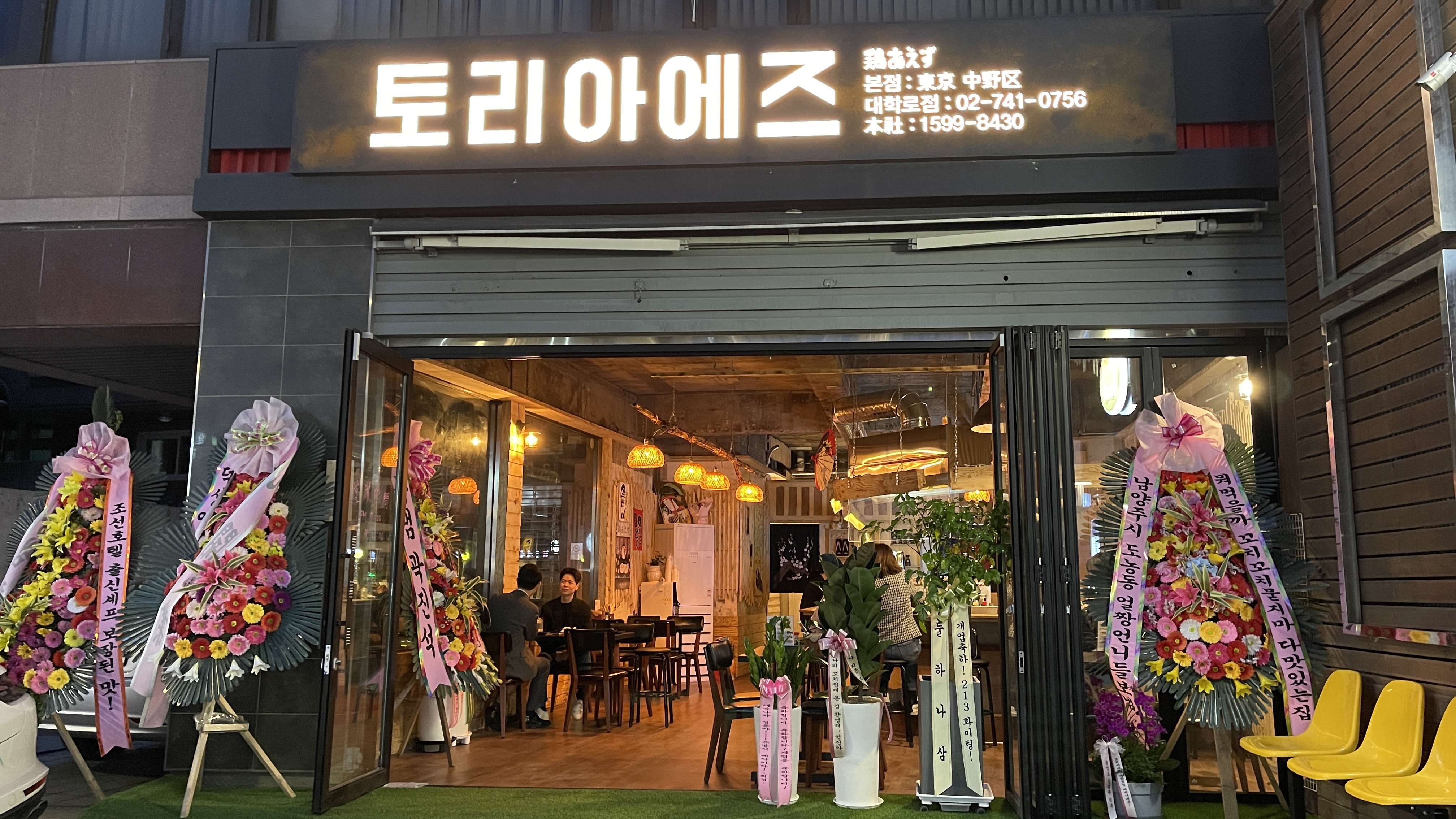 혜화역 4번출구에서 나와 cgv앞을 지나 성대 쪽으로 가는 4거리 쪽에 위치한 대학로 토리아에즈. 알고 보니 꼬치 체인점이더라구요. 직접 꼬치를 잘생기고 친절하신 사장님께서 구워주시는 고급진 혜화 데이트 맛집이었습니다.