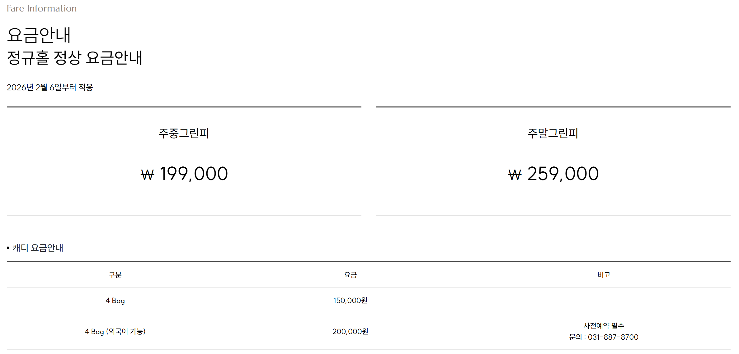 공식 홈페이지 기준, 현재 주중 그린피는 20만 원대 중후반, 주말 그린피는 30만 원대 초중반으로 형성되어 있습니다. 여기에 팀당 카트비 12만 원, 캐디피 15만 원(지정 캐디 시 추가 요금 발생 가능)이 적용됩니다. 하이엔드 서비스를 제공하는 만큼 가격대는 다소 높지만, 그 이상의 가치를 충분히 증명해 내고 있습니다.