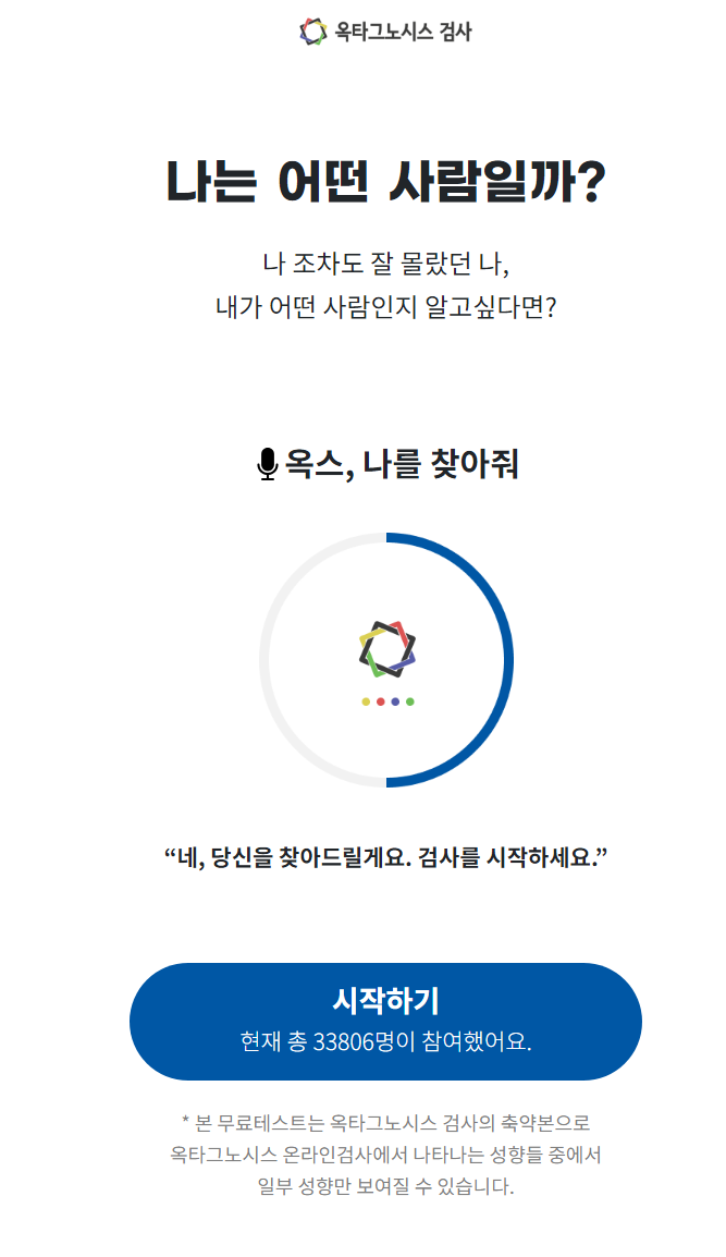 현재 33,806명이 진행했다고 하네요! 옥타그노시스(OGS)검사는 국내 유일 특허받은 검사인데요. '나를 찾아줘' 검사는 그 옥타그노시스 검사의 축약본으로 1성향을 알아낼 수 있는 검사입니다!