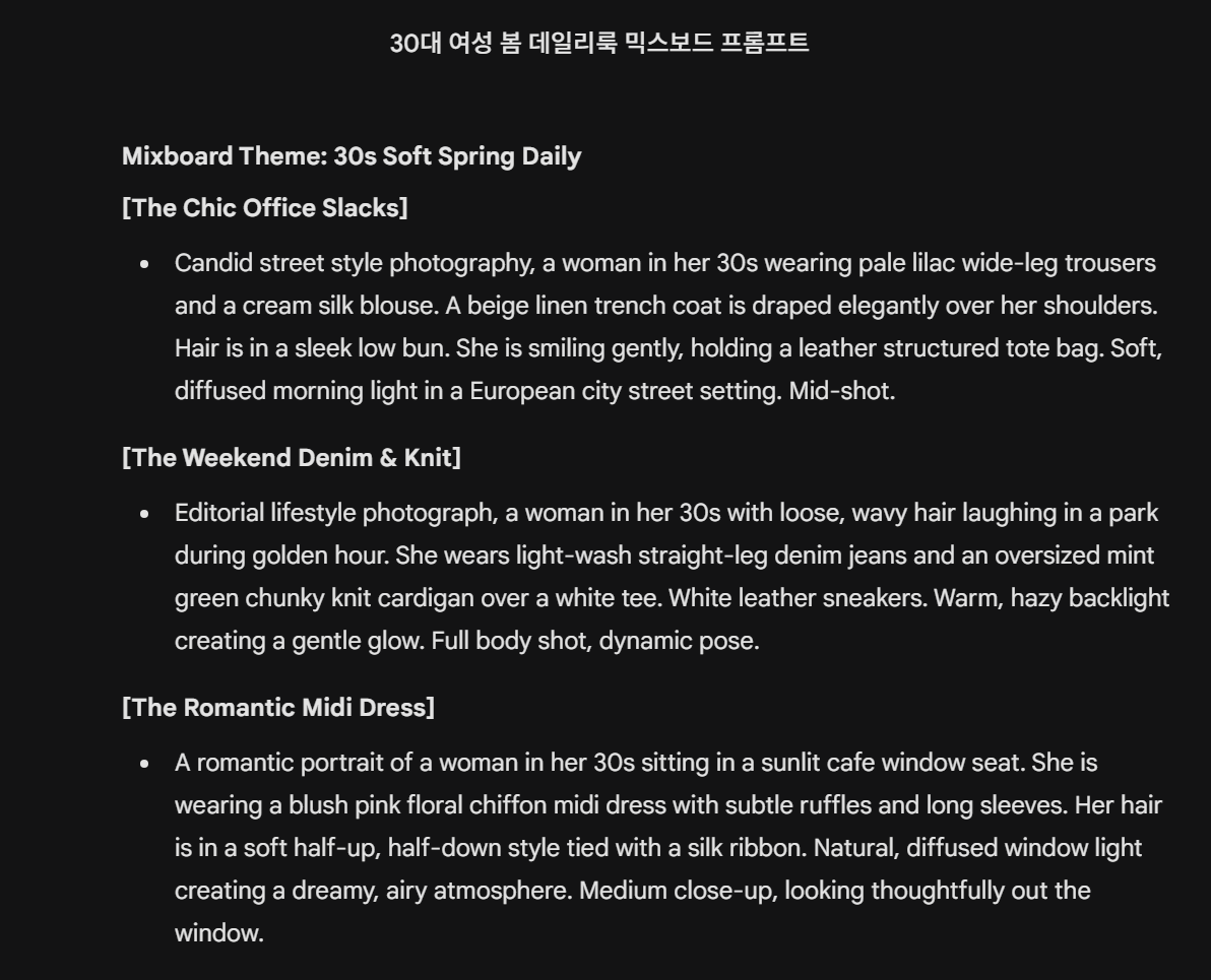 "너는 지금부터 패션 매거진 에디터야. '20대 여성 봄 데일리룩'을 주제로 믹스보드(Mixboard)를 만들려고 해.