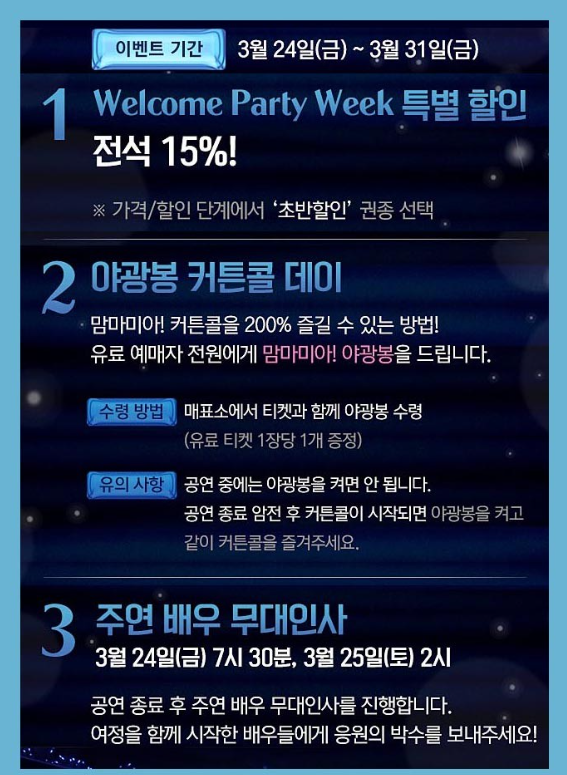- 단, 4/12(수), 4/19(수) 2시 30분 낮 공연(저녁 공연 없음)