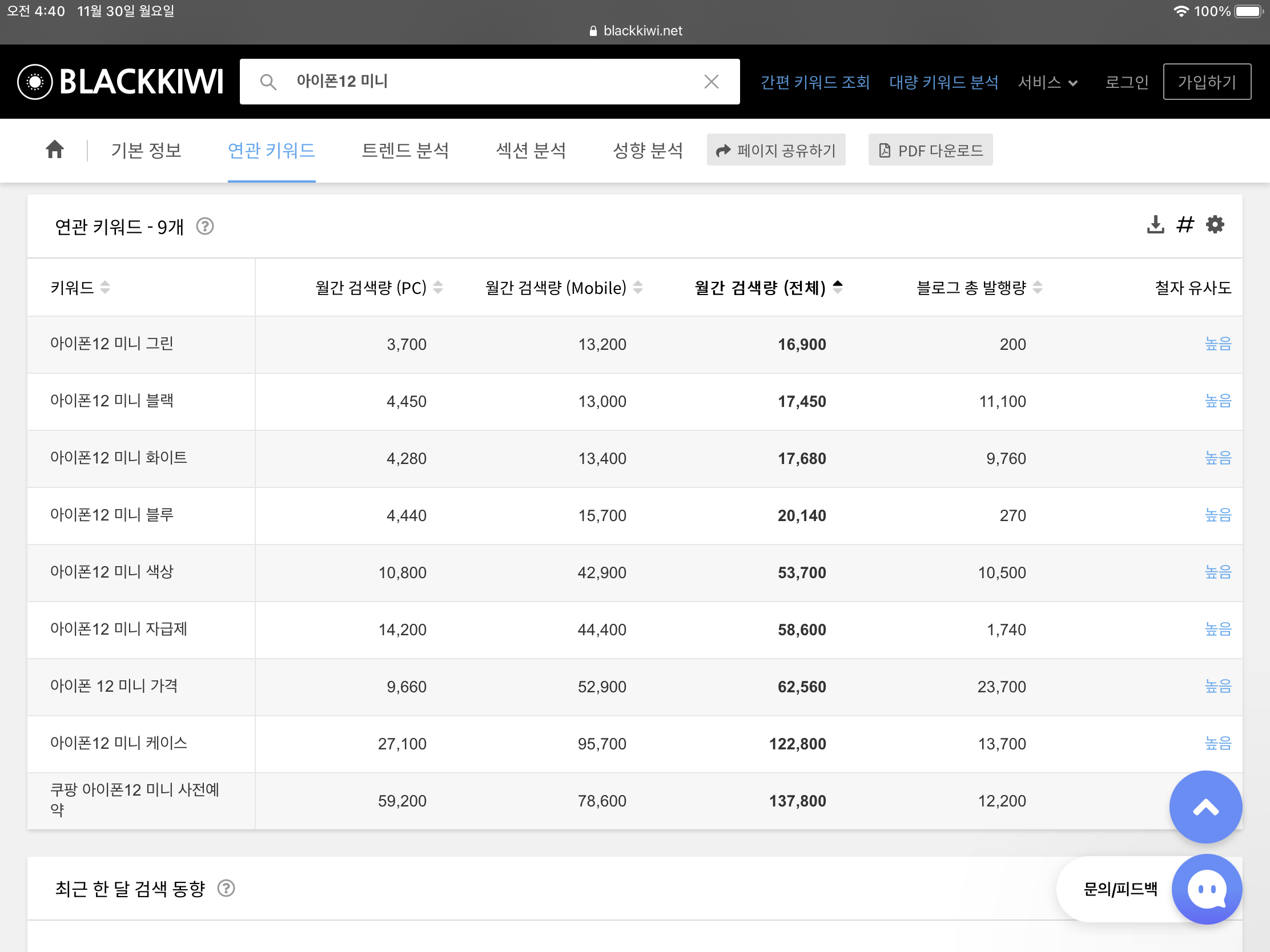 또한 검색어에 대한 성향 분석이 되어있어서 상업적인 글을 작성할 경우에는 소비자에 대한 분석에 신빙성을 주는 자료로도 사용할 수 있는 사이트는 오히려 블랙키위 쪽이 될 것 같습니다. 확실히 한 키워드에 대한 상세한 정보를 제공하는 것은 블랙키위이고, 간편하게 빠르게 조회를 할 때는 키워드 마스터를 사용할 것 같다는 생각이 듭니다!