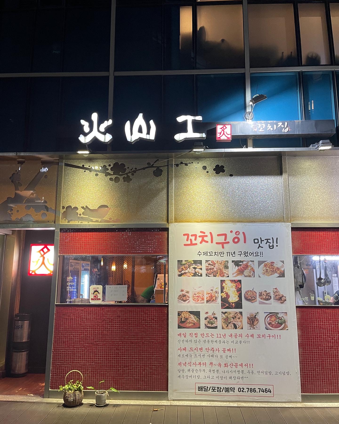 오홍! 요기 처음 가봤는데 괜찮았어요!! 삼각지 남영역 사이 쯤에 있는 꼬치구이 맛집 화산공이랍다~! 한자 못 읽어도 가실 수 있게 입구부터!