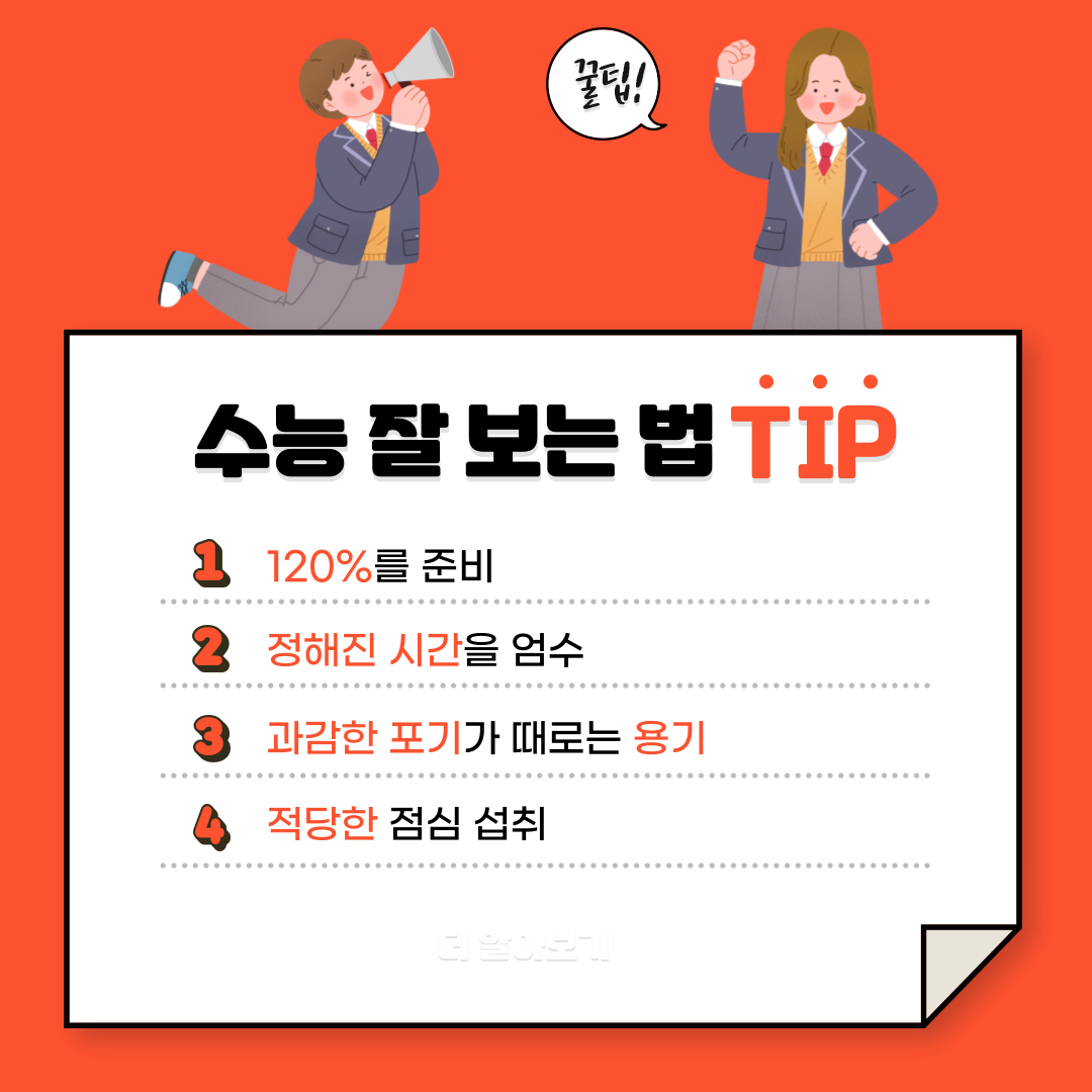 어제부터는 페이크삭스를 신으시거나 맨발로 발목을 내놓고 다니신 분들 아마 밤 쯤에는 발목이 끊어지시는 줄 알았을 겁니다. 그 이유가 있습니다 11월 들어 최저온도 영하날씨가 시작되었기 때문입니다. 그런데 이렇게 추워지는 11월이면 정말 중요한 국가적 이벤트가 있다는 것이 생각납니다. 바로 수학능력시험. 수능입니다. 많은 수험생들이 고생하고, 수험생들을 돌보는 학부모님들이나 수험생을 응원하는 지인들 모두 긴장되는 순간이 다가오고 있는데 이 중요한 이벤트를 어떻게 하면 지혜롭게 이겨낼 수 있을지 살펴보겠습니다!