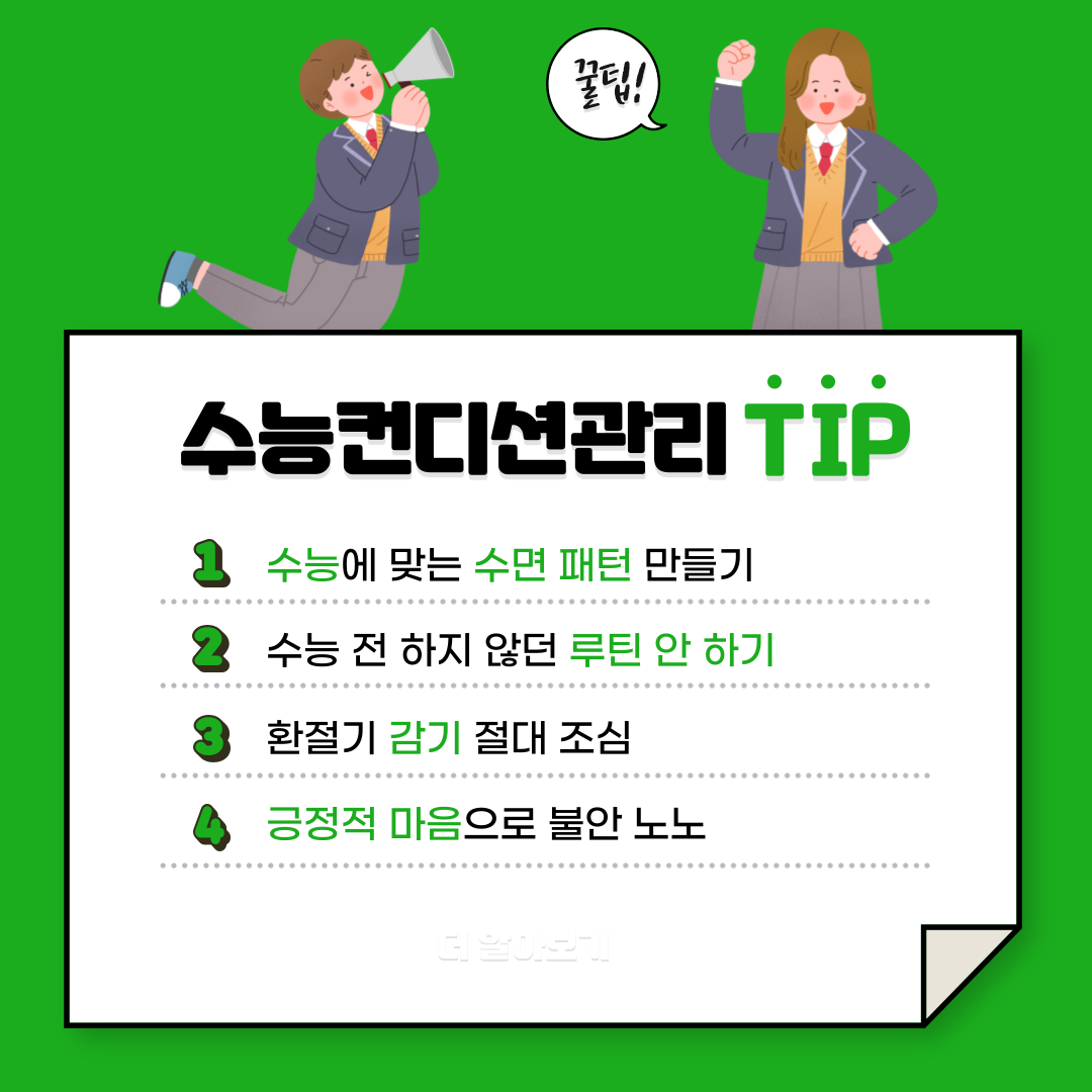 어제부터는 페이크삭스를 신으시거나 맨발로 발목을 내놓고 다니신 분들 아마 밤 쯤에는 발목이 끊어지시는 줄 알았을 겁니다. 그 이유가 있습니다 11월 들어 최저온도 영하날씨가 시작되었기 때문입니다. 그런데 이렇게 추워지는 11월이면 정말 중요한 국가적 이벤트가 있다는 것이 생각납니다. 바로 수학능력시험. 수능입니다. 많은 수험생들이 고생하고, 수험생들을 돌보는 학부모님들이나 수험생을 응원하는 지인들 모두 긴장되는 순간이 다가오고 있는데 이 중요한 이벤트를 어떻게 하면 지혜롭게 이겨낼 수 있을지 살펴보겠습니다!