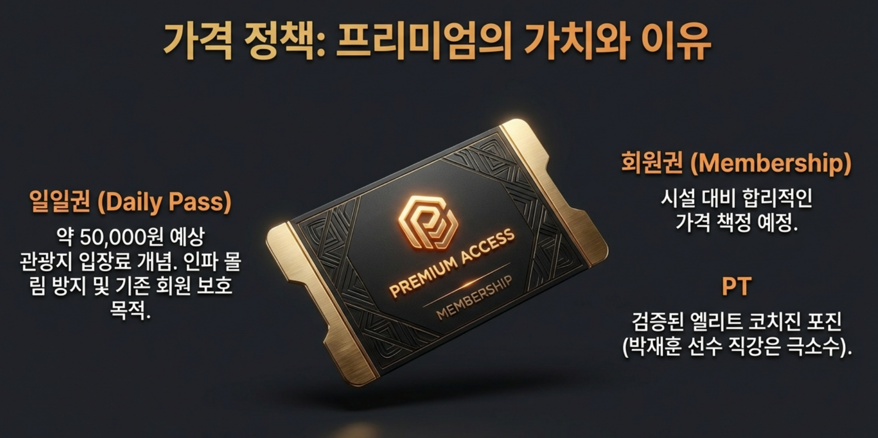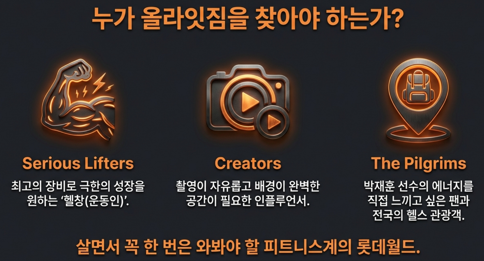 - 압도적 가치: 수십억 원대의 하이엔드 머신을 체험하고, 박재훈이라는 아이콘과 같은 공간에서 운동하는 비용입니다.
