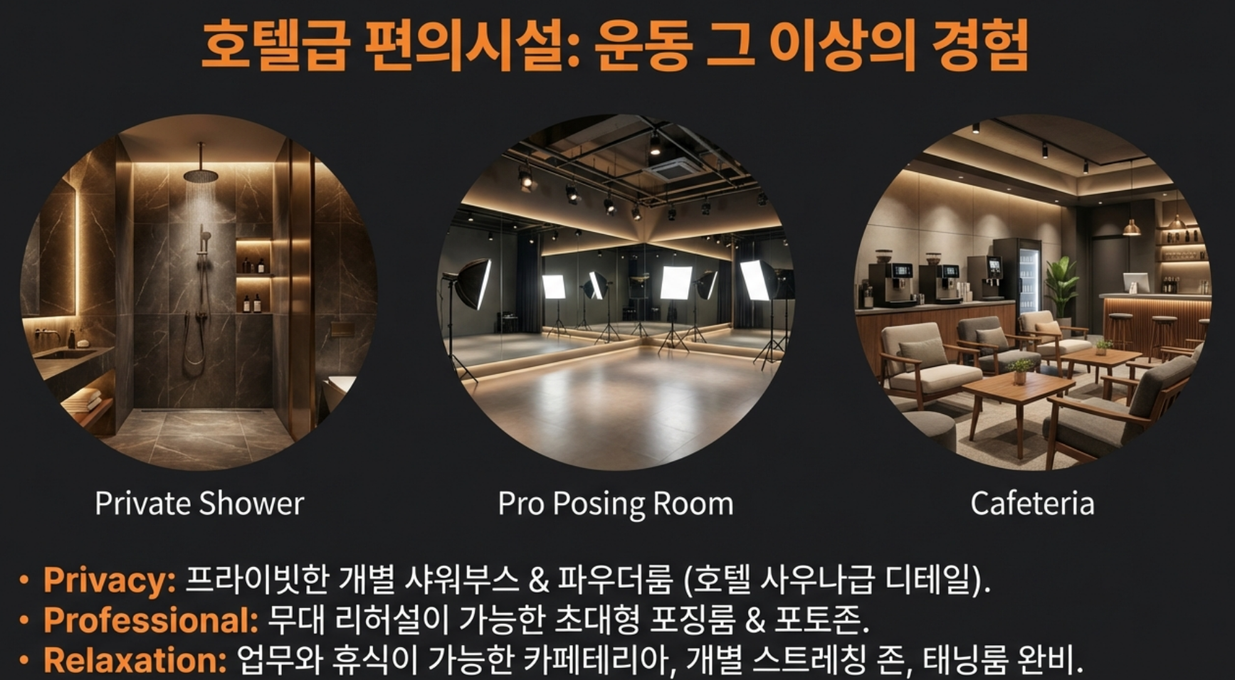 - 대형 포징룸: 일반 헬스장의 2배 크기이며, 거울 각도가 무릎·골반 정렬을 체크하기 좋게 설계되었습니다.