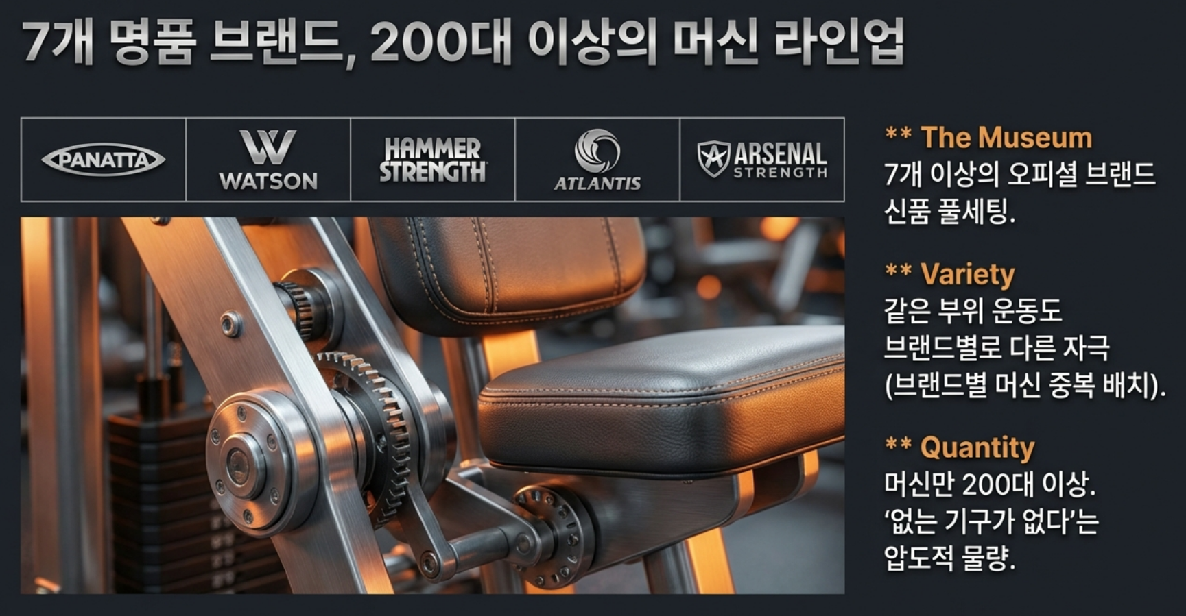 - 부위별 믹스 매치: 예를 들어 어깨 운동을 한다면, 단순히 한 브랜드의 기구만 쓰는 게 아니라 각 브랜드별 최고의 어깨 머신을 모두 써볼 수 있도록 배치했습니다.