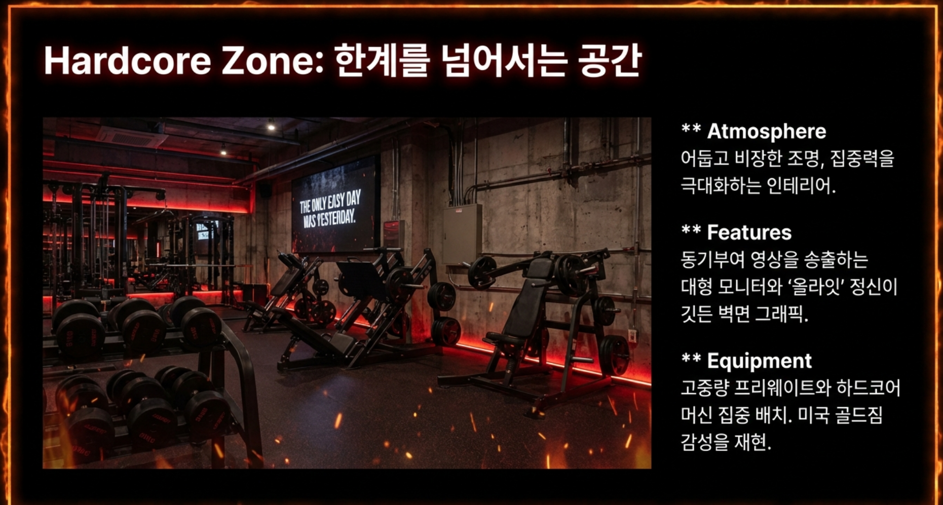 - 공간 분리: 센터는 크게 어두운 조명의 '하드코어 존'과 밝은 우드톤의 '노말 존'으로 나뉩니다.