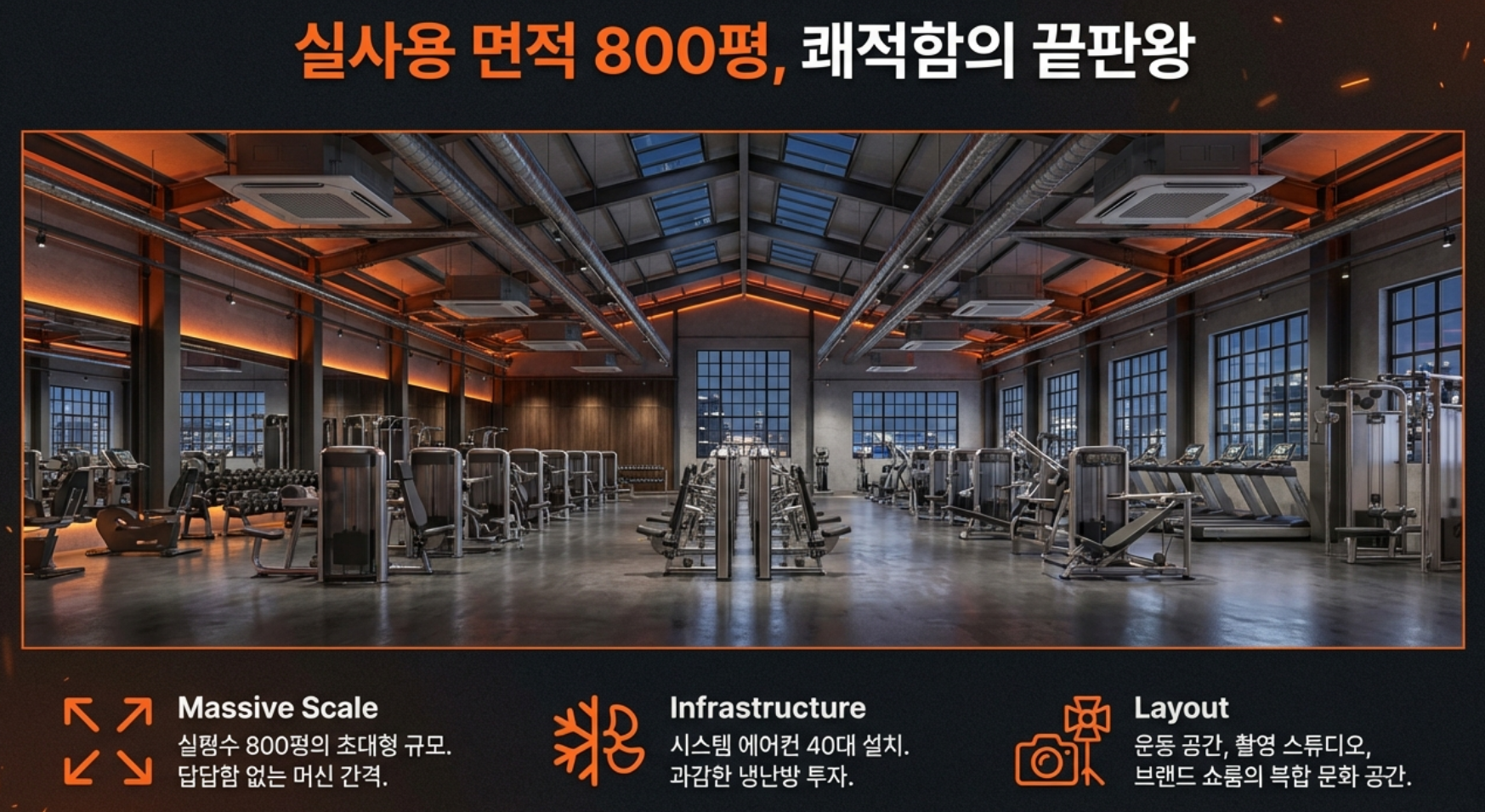 - 압도적 규모: 실사용 면적만 약 800평에 달하며, 높은 층고 덕분에 체감 평수는 2,000평 이상으로 느껴집니다.