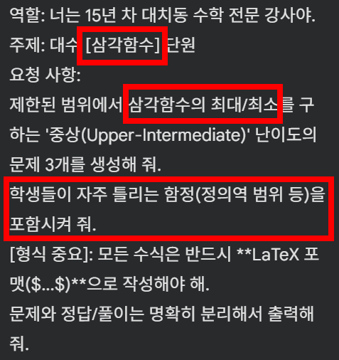많은 분들이 AI에게 "수학 문제 좀 내줘"라고 단순하게 묻습니다. 그러면 AI는 초등 수준의 엉성한 문제를 내놓죠. 핵심은 '페르소나 부여'와 '출력 형식 고정'에 있습니다.