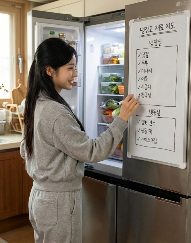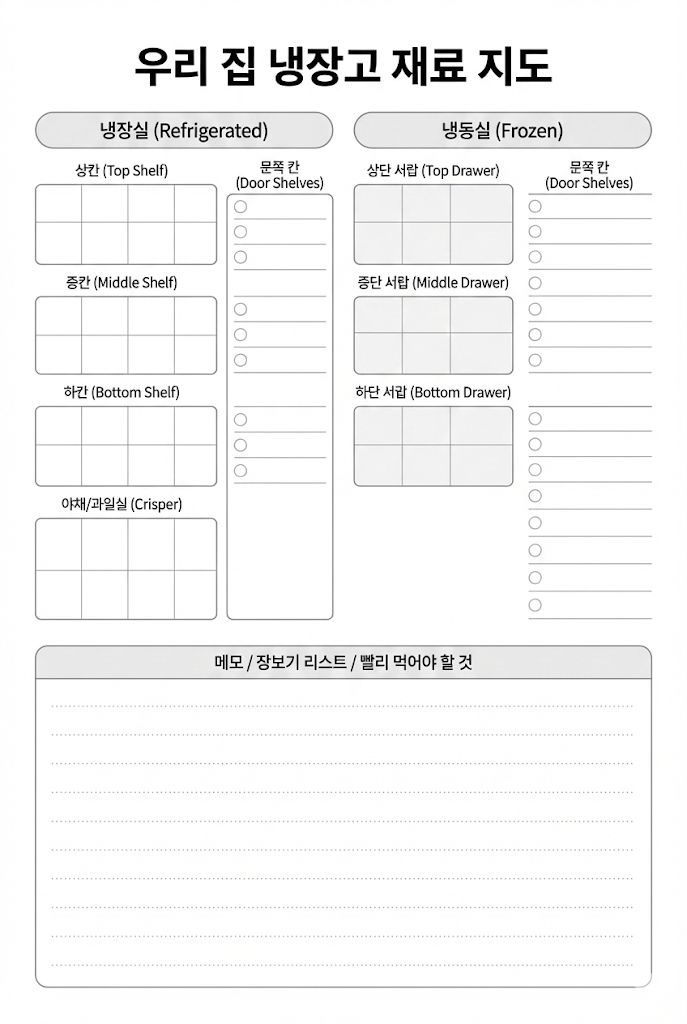 무작정 냉장고를 파먹는 게 아닙니다. 냉장고 문에 '재료 지도(리스트)'를 붙여두세요. 뭐가 있는지 한눈에 보여야 버리는 재료 없이 알뜰하게 써먹을 수 있습니다.