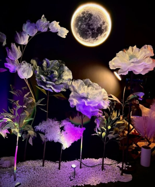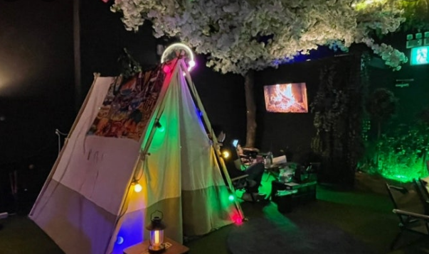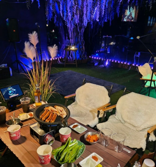 이곳의 분위기는 정말 아늑하고 따뜻해요. 여러 개의 텐트가 푸른 카펫 위에 자리를 잡고 있으며, 부드러운 조명과 스트링 조명이 공간을 아늑하게 만들어줘요. 특히, 장식용 벚꽃 나무들이 자연의 느낌을 더해주어 캠핑의 분위기를 한층 높여준답니다.