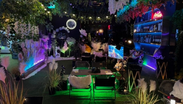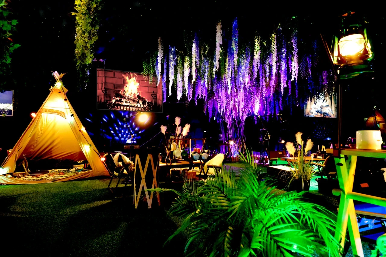 중심에 배치된 큰 노란색 텐트는 각종 색상의 조명으로 더욱 화려하게 꾸며져 있어요. 이곳은 친구들과의 인증샷 남기기에도 제격이랍니다.