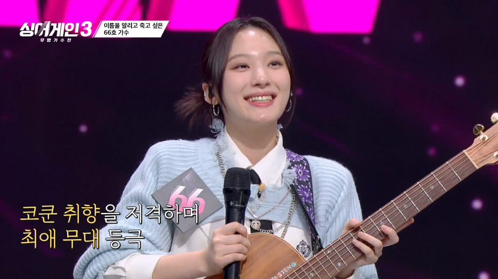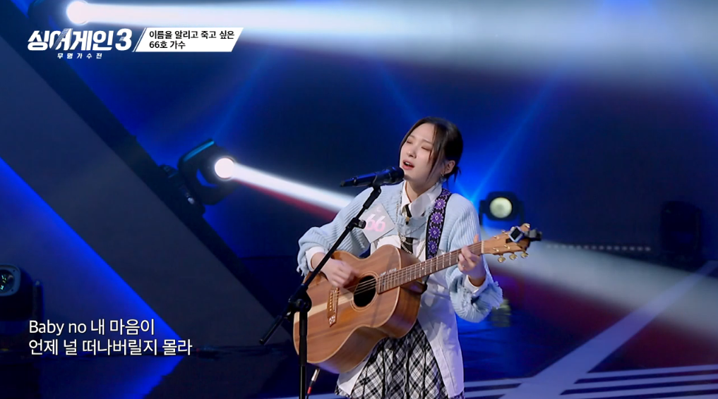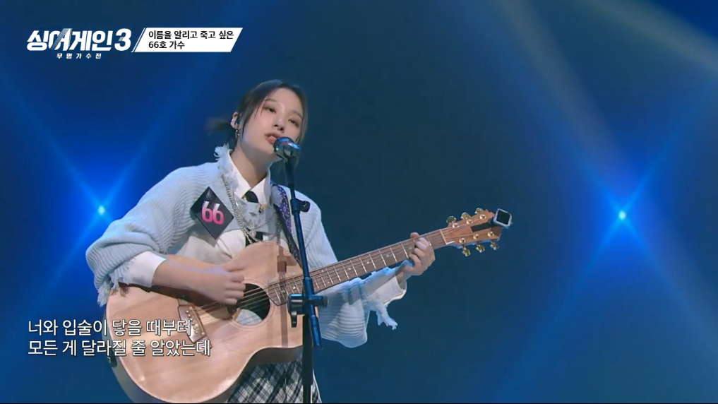 싱어게인3 2회에서 66호는 원더걸스의 'why so lonely'를 부르며, 마치 설인아를 연상케 하는 외모에 독특한 기타연주와 편곡스타일로 많은 남성팬분들의 가슴을 설레게 하였습니다.