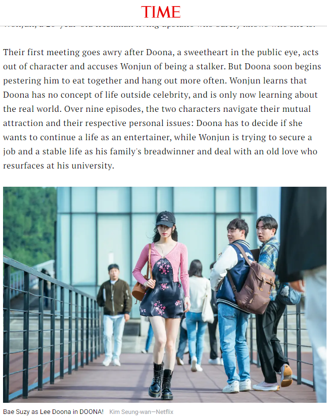 TIME에서도 'Doona!'에 등장하는 이두나 역의 수지 위주로 기사가 작성이 되었는데요. 미스에이 시절부터의 커리어와 이번 'Doona!'에서 수지가 기대되는 이유 등을 다루며, 'Doona!'에 대한 기대를 높혔습니다.