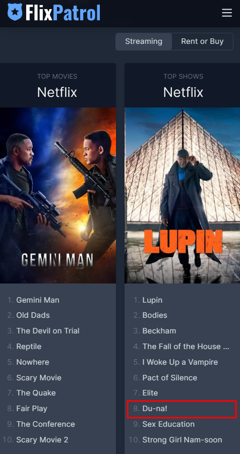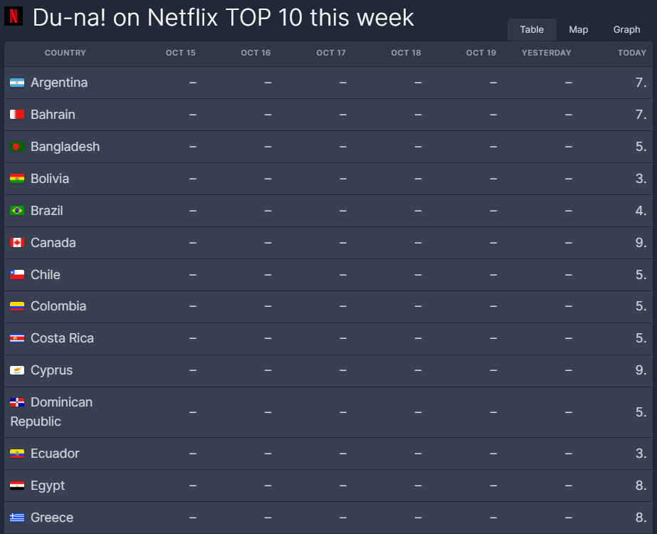 드디어 '이두나!'의 첫날 해외 순위가 해외에서 가장 공신력 있는 OTT사이트 flixpatrol을 통하여 공개되었습니다.