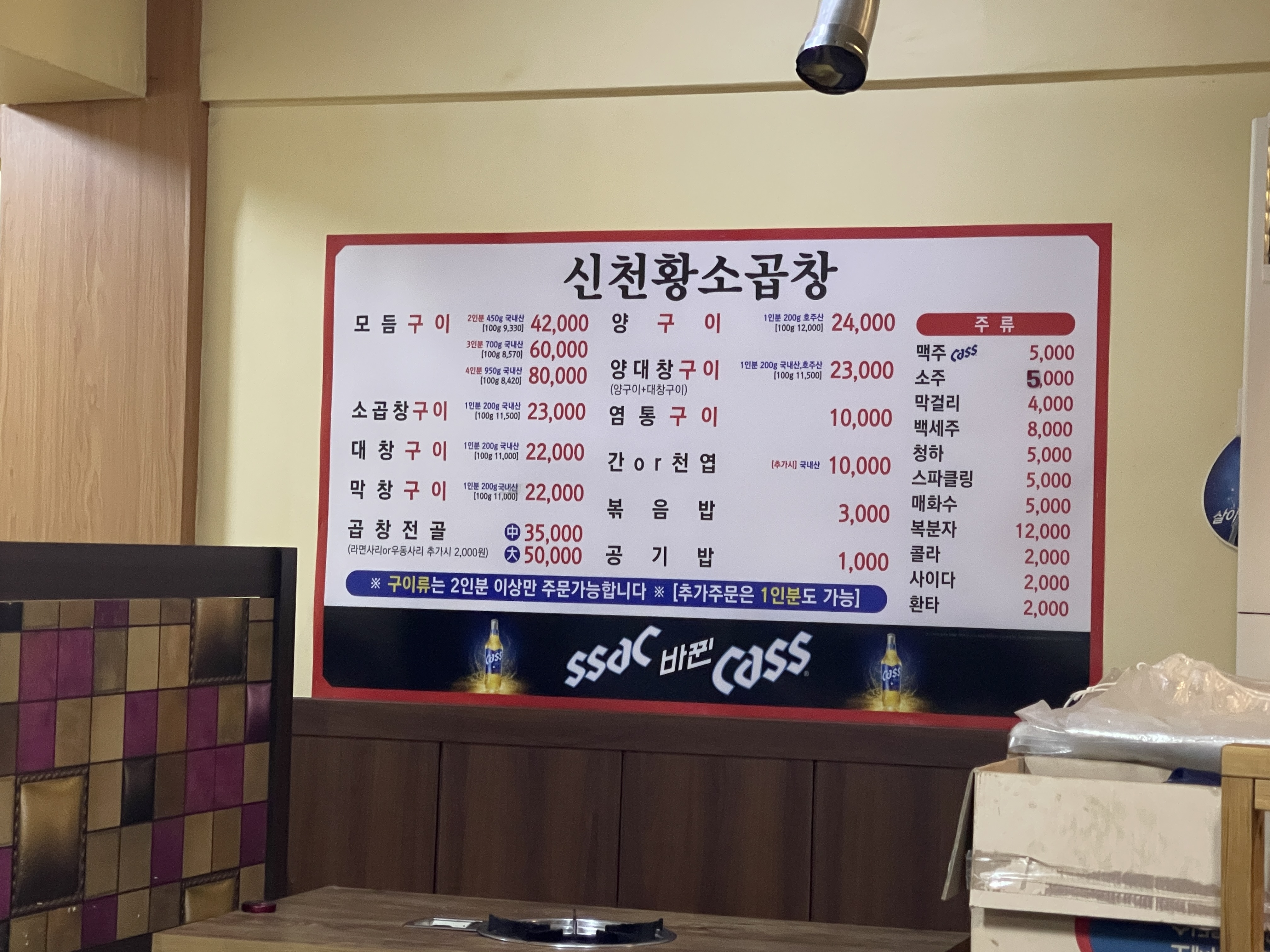 찾아간 곳은 신천황소곱창!! 소곱창은 언제 먹어도 맛있으니 메뉴 선정 벌써 굿이구요! 저희는 소곱창 대창 막창 중에서는 소곱창과 대창을 좋아해서 소곱창 대창부터 시켰는데 먹다보나 부족해서 계속 시킴!!