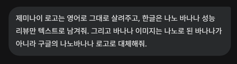 제미나이의 로고를 반영한 것까지 굉장이 좋았으나, 성능을 그대로 퍼포먼스로 받아들였고 실망스러웠던 포인트는 바나나가 진짜 나노(?)로 나뉘어진 바나나라니.. 왜 저렇게 만들었나 했더니 제가 친 프롬프트 그대로 만들어준 것 같기도 하여, 어느 정도 수정된 프롬프트를 사용해봅니다!