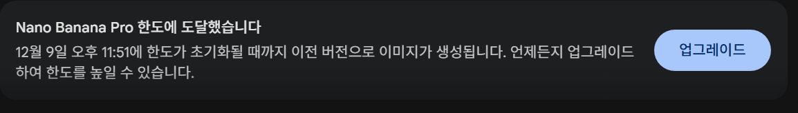 다음과 같이 나노 바나나 프로를 사용할 수 있는 한도수에 도달하였습니다. 4개의 이미지를 생성한 후 업그레이드를 권유하는군요!