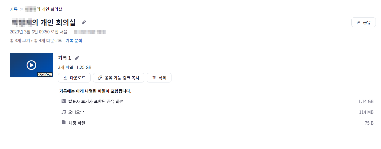 그리고 클라우드 회의명을 누르면 다음과 같은 페이지를 볼 수 있는데요. 이곳에서는 클라우드에 저장되어 있는 녹화 파일의 다운로드도 가능할 뿐 더러 클라우드에 연결된 링크를 공유하여 다른 사람들에게 영상을 전달할 수도 있습니다. 그래서 클라우드 녹화를 하면 이런 부분이 정말 편하답니다.