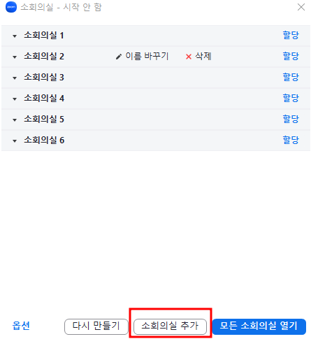 소회의실 추가 버튼을 누르면 위와 같이 소회의실이 생성된 것을 확인하실 수 있는데요. 소회의실에 커서를 대면 이름을 변경할 수 있어 소그룹 명으로 바꿔주시면 됩니다.