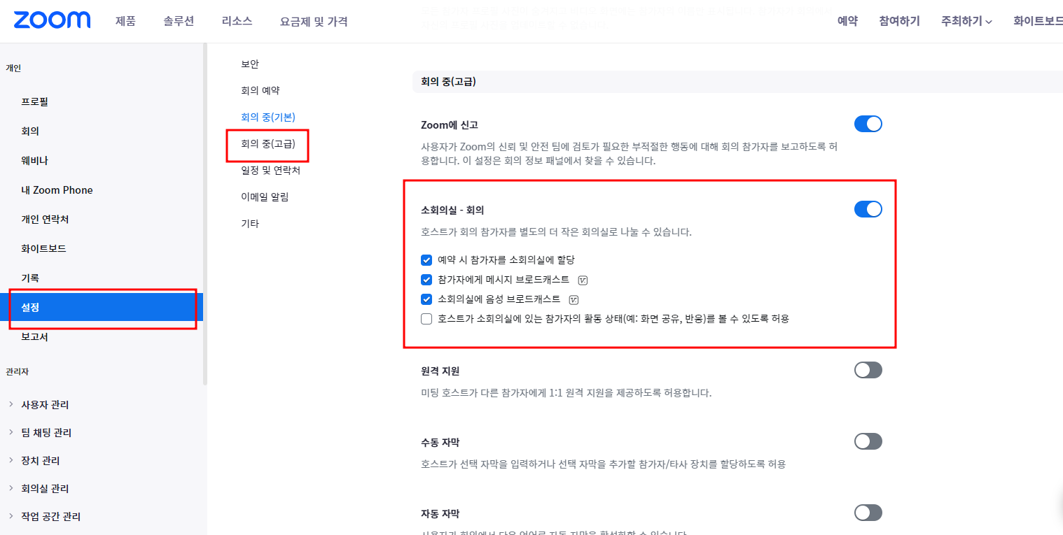 일단 회의에서 소그룹을 활성화 시키는 설정 방법부터 설명드리겠습니다. 줌 홈페이지 - 설정 - 회의중(고급) - 소회의실-회의라는 선택지를 활성화 시키면 위와 같이 소회의실이 활성화 됩니다.