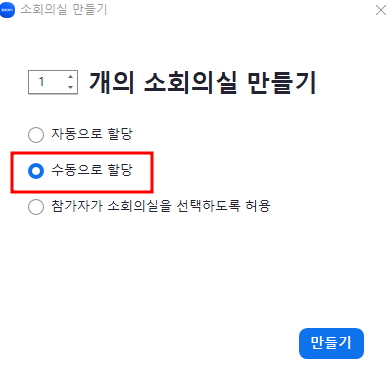 줌 홈페이지에서 설정 후 줌을 실행시켜 보면 소회의실이 활성화 되어있는 것을 확인하실 수 있는데요. 소회의실을 무작정 누르는 것이 중요한 것이 아니라 소회의실 개설 전 설정이 매우매우 중요합니다!! 안 그러면 소회의실 일정 진행 중 모두 다시 대기실로 나오게 되는 대참사를 겪으실 수도 있어요!