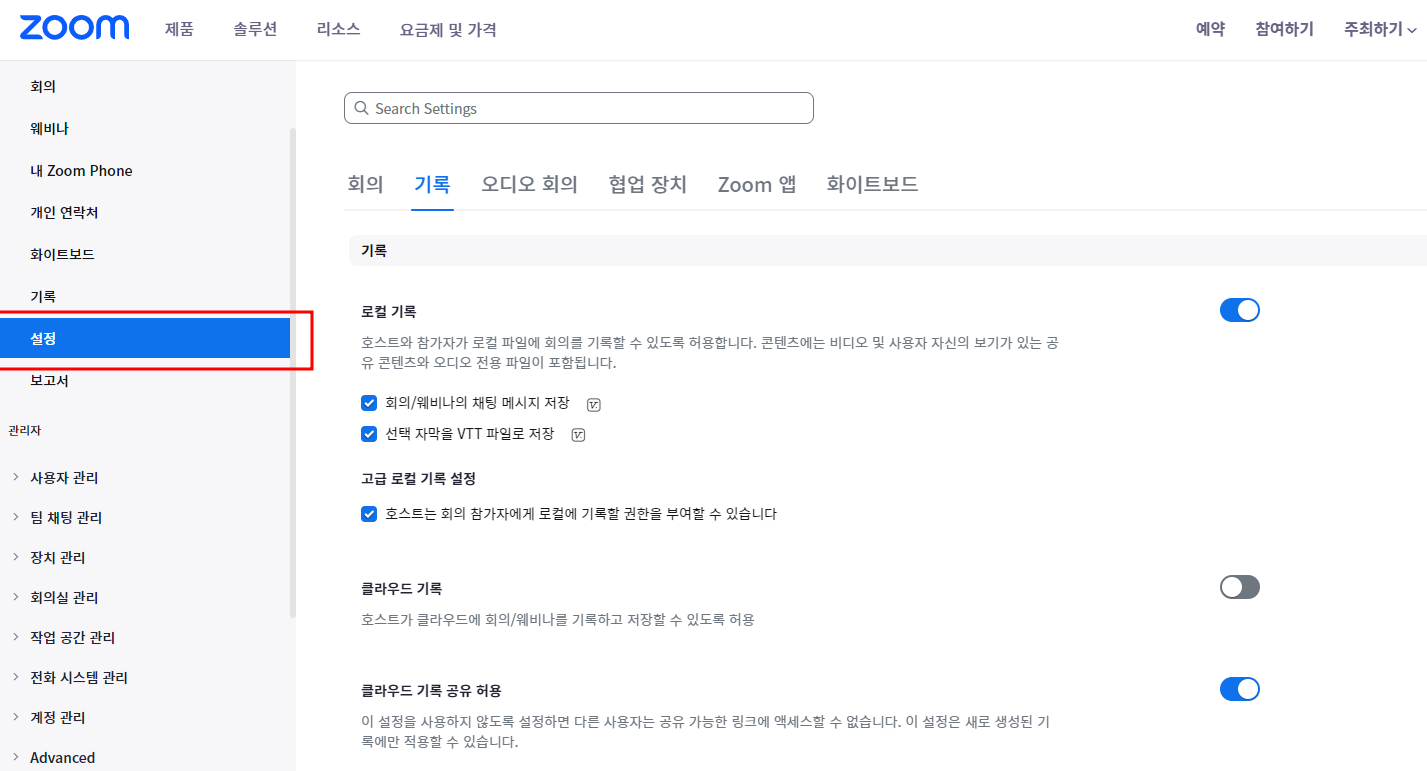 줌 녹화를 하는 법은 우선 줌을 켜기 전에 줌 사이트에서 설정이라는 페이지에서 설정을 해야만 줌 프로그램에서 녹화 버튼이 활성화됩니다.