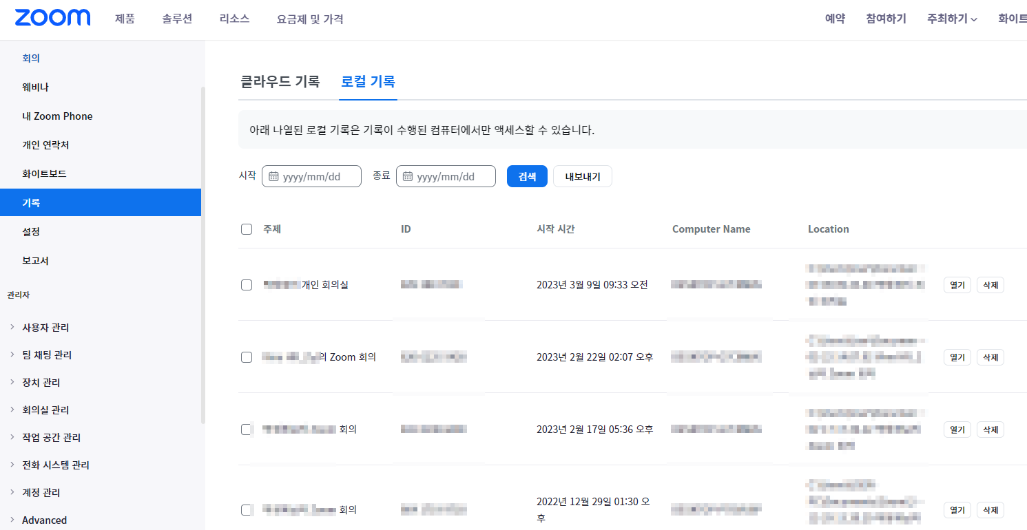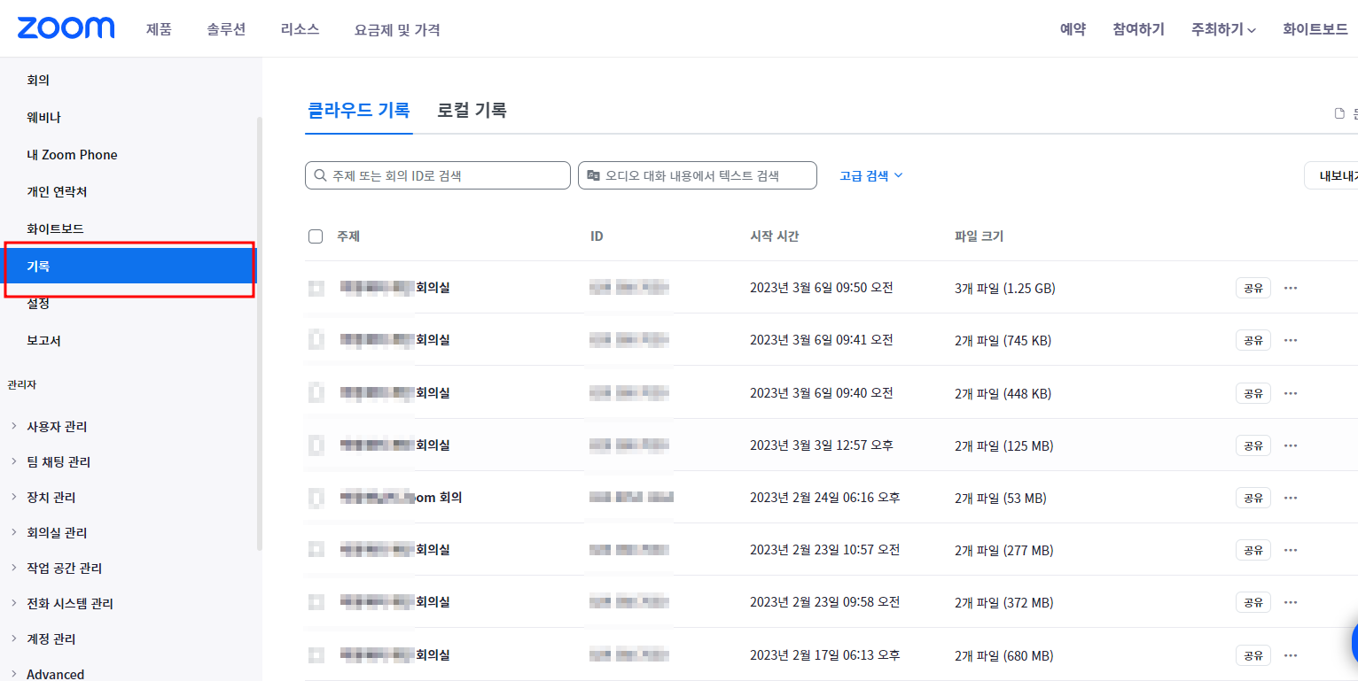줌 홈페이지 화면 중 왼쪽 기록을 클릭하면 클라우드 기록과 로컬기록을 선택하는 메뉴를 볼 수 있습니다. 클라우드에 계속 진행된 일정들이 자동으로 녹화가 되어있는 것을 확인 할 수 있네요.