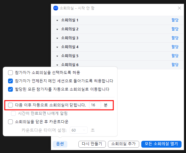 여기서 진짜 중요한 설정이 있습니다. 소회의실 옵션에서 선택여부에 따라 정말 많이 달라지는 기능이 있는데요. 바로 자동 소회의실 닫기 기능이에요. 이 기능을 잘못 클릭하게 되면 1시간짜리 일정에서 갑자기 다 소회의실 대탈주 하는 일이 벌어지기도 하구요. 아니면 5분만 소그룹토의를 해야하는데 소회의실에서 안 나와서 일정이 지연되는 사태가 벌어지기도 합니다. 그렇기 때문에 위 설정은 반드시 주의해주세요!