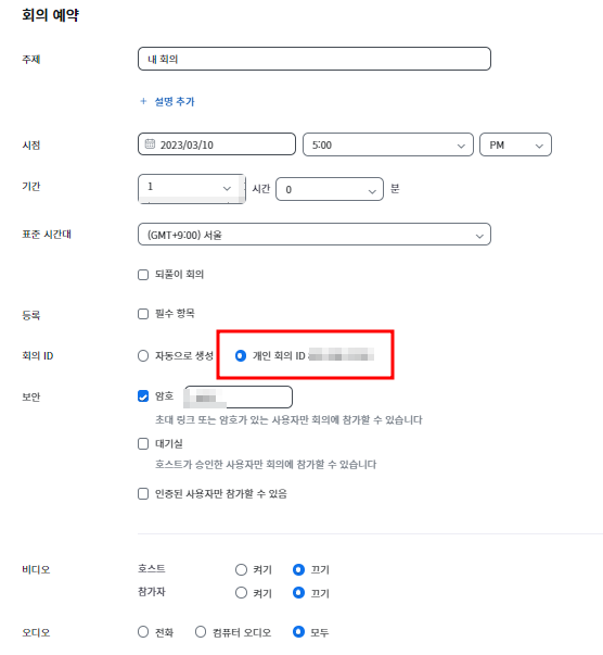 저 같은 경우는 자동으로 생성되는 회의ID를 사용하지 않고, 개인 회의 ID를 사용하는데요. 그 이유는 2가지입니다.