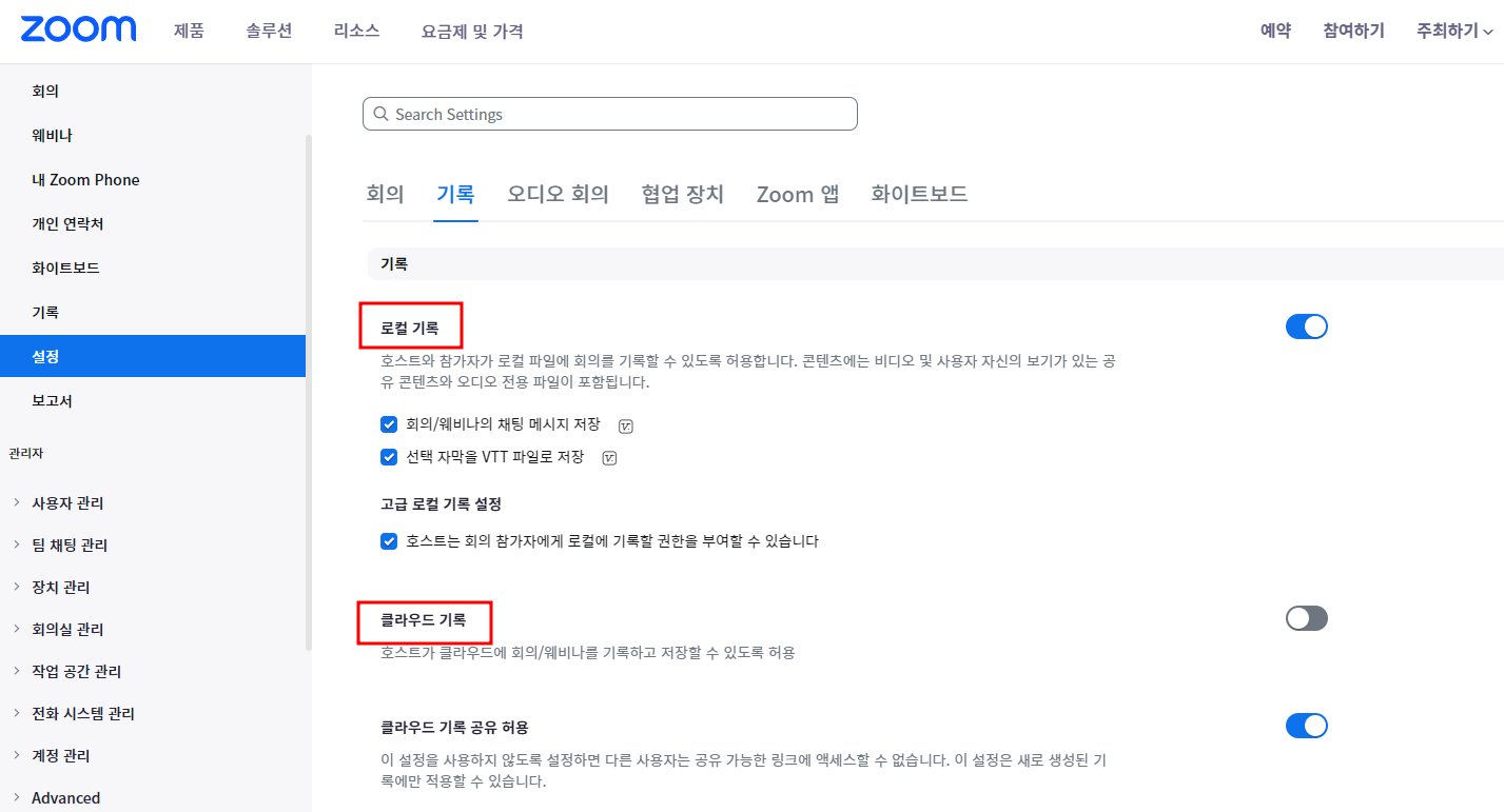 녹화 방법은 2가지가 있어요. 로컬기록과 클라우드 기록이라는 메뉴가 보이네요. 차이를 설명드리겠습니다.