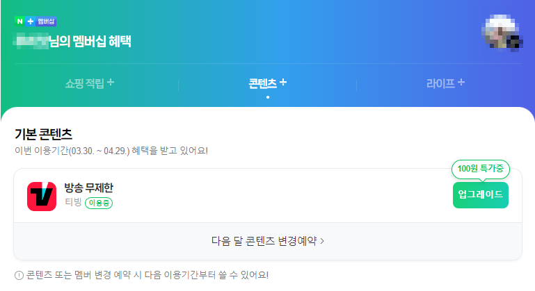 저는 티빙을 접하게 된 것이 티빙으로 가입을 했다기 보다는 네이버를 통해서 가입하게 되었는데요. 바로 네이버 플러스 멤버십 서비스입니다. 저는 그 중에서도 티빙 무료 이용을 사용하고 있어요!! 물론 무료 이용이기 때문에 영화 다시보기가 불가하다는 것은 함정이에요. 영화는 그래도 넷플릭스가 디즈니 플러스에서 보고 있으니.. 티빙에서는 티빙오리지널을 볼 수 있다는 것만으로도 엄청난 혜자 혜택이 아닐 수 없습니다.