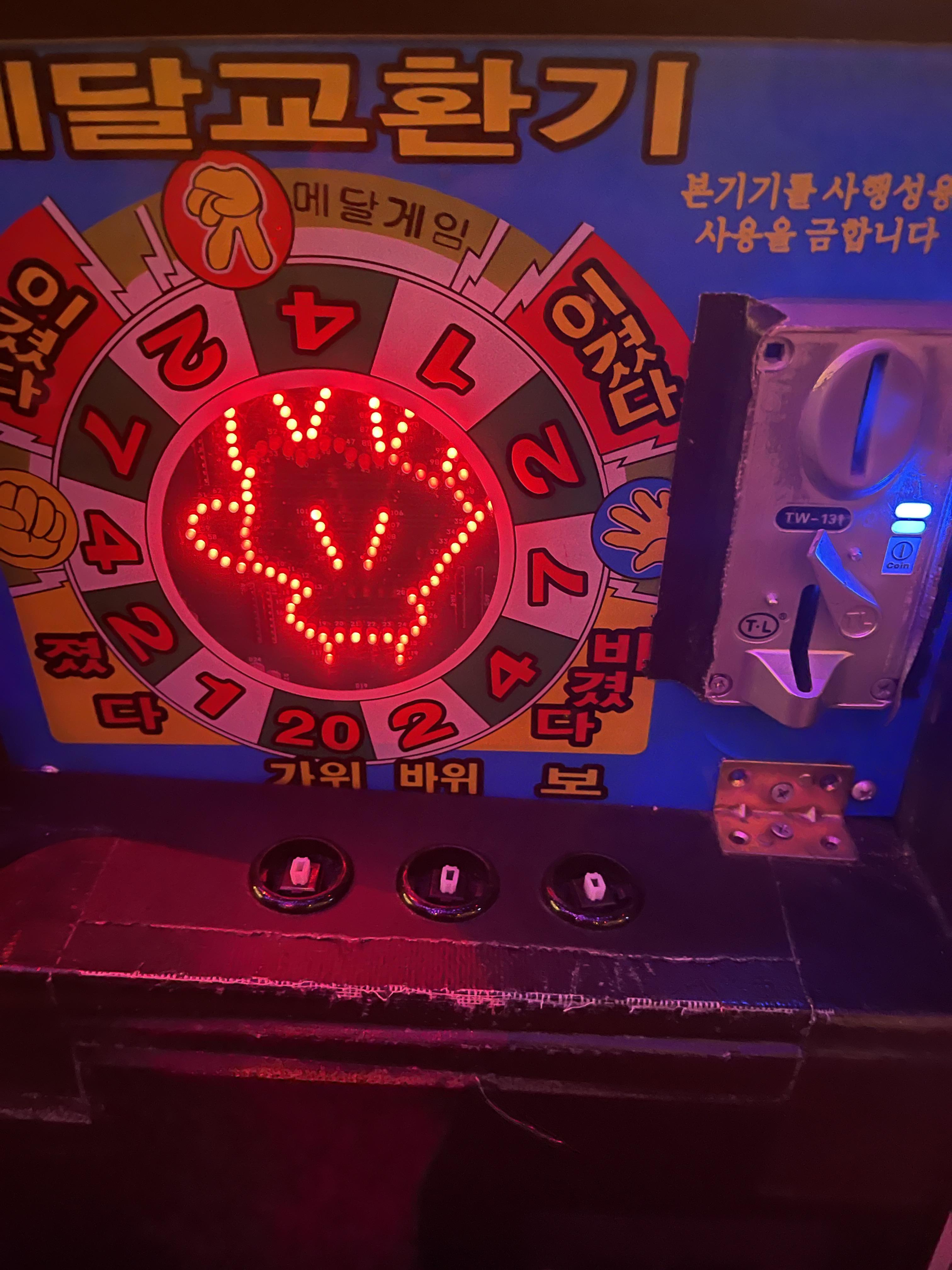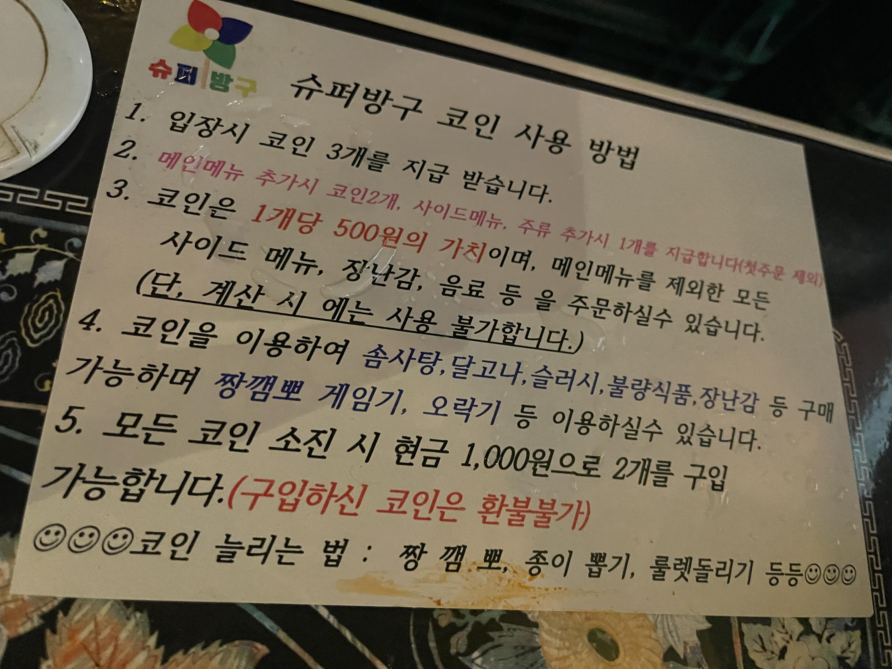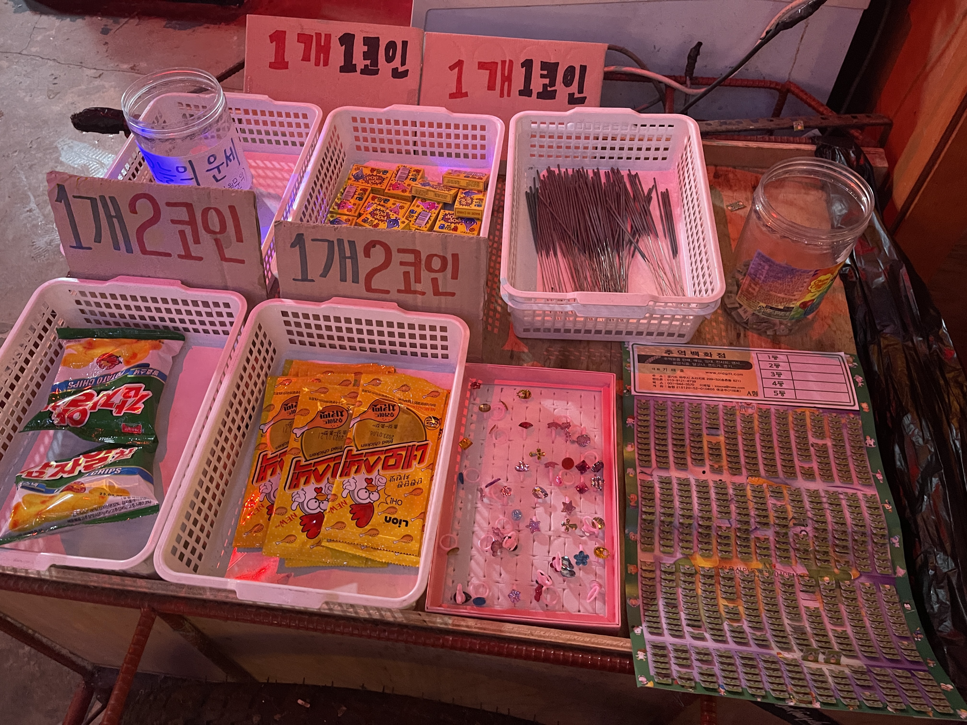 자리에 앉으면 코인을 주시는데요! 이 코인은 불량식품 같은 것을 사먹을 수도 있고 여러 게임을 할 수도 있어요!