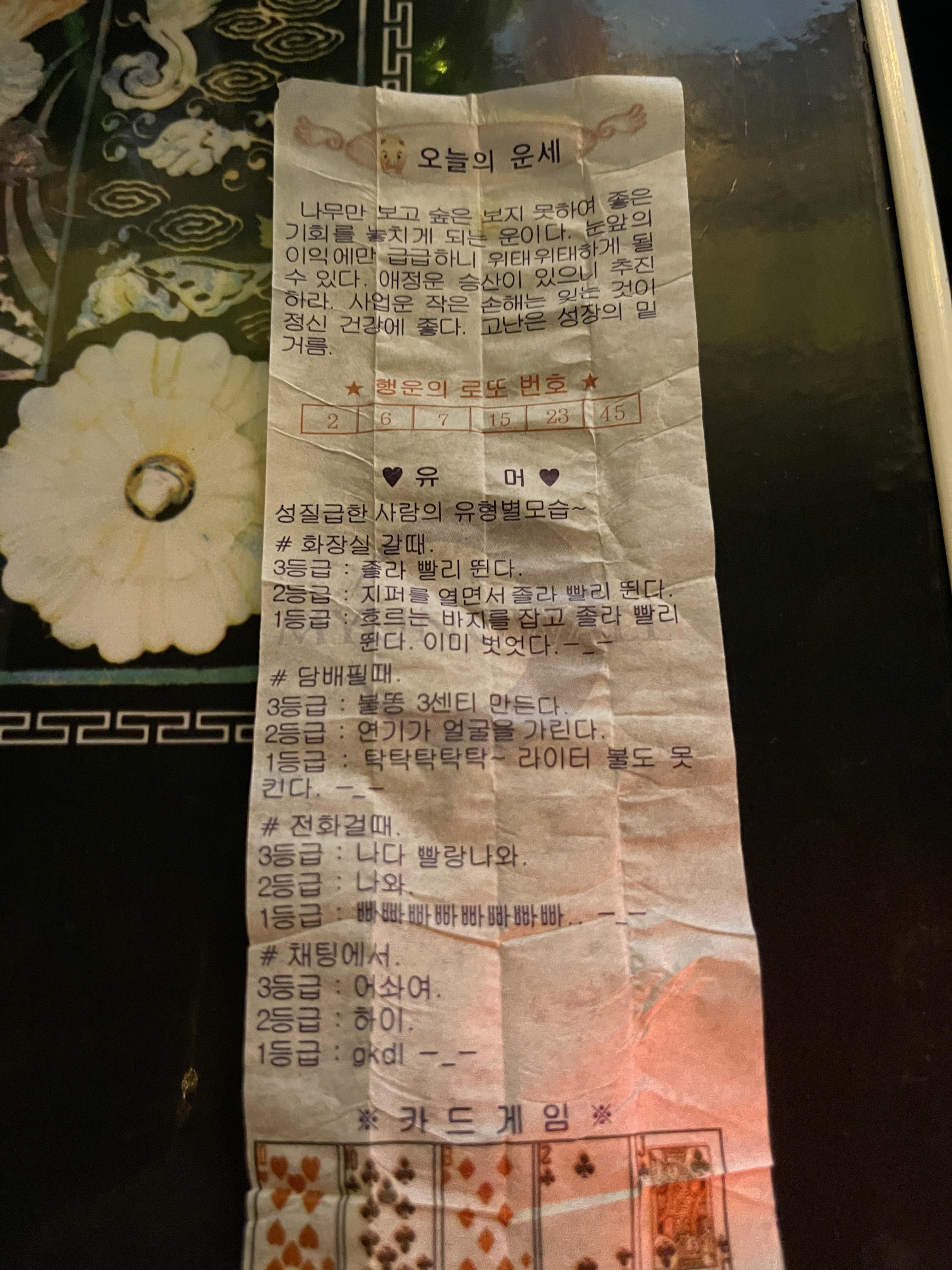운세 뽑기도 있어서 운세 뽑아주시구요!! 정작 닭도리탕 핵맛있게 소주 각 3병 먹었는데 음식사진은 안 찍고 코인 버는데에 더 몰두 했네요 ㅠㅠㅠ