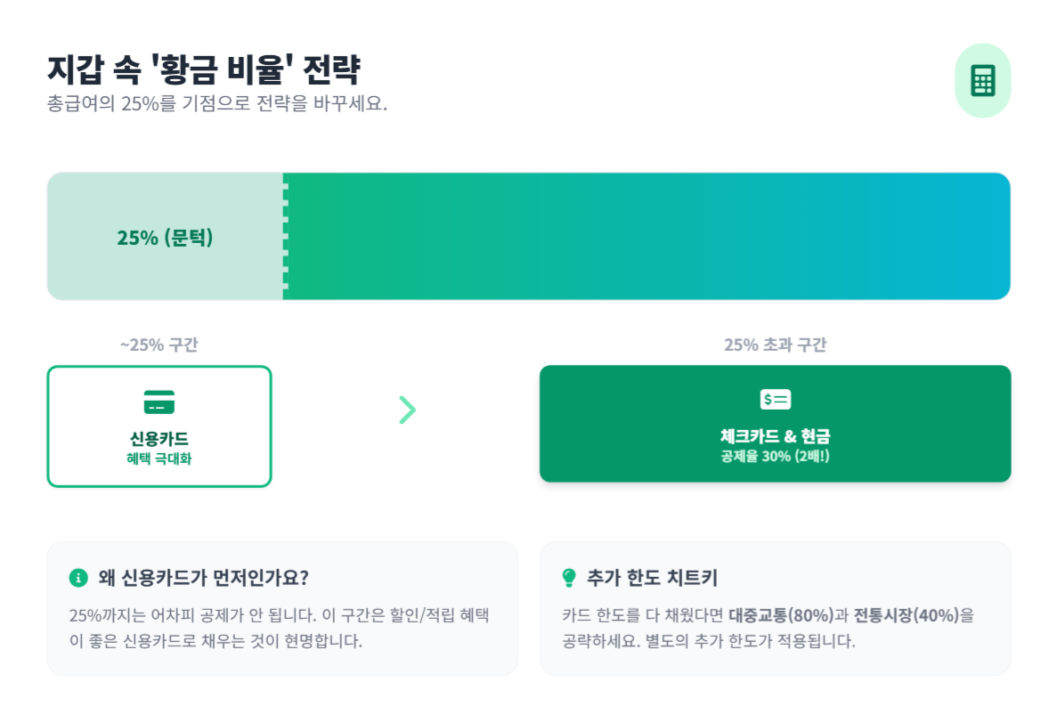 어차피 이 구간은 공제가 안 됩니다. 공제율 신경 쓰지 말고, 카드사 할인, 포인트 적립 혜택이 좋은 신용카드를 써서 '체리피킹' 하세요. - Step 2 (25% 초과 ~ 한도까지): 체크카드/현금영수증 사용