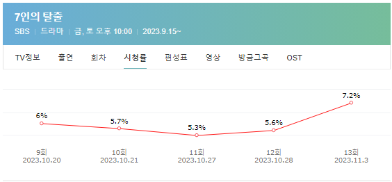MBC연인이 10%가 넘는 시청률을 기록하는 가운데, 7인의 탈출은 김순옥 드라마의 성공 공식이 무색하게도 5%의 시청률대를 기록하며 고전을 면치 못하고 있었습니다. 하지만 11월 3일 연인의 결방으로 인해 시청률이 무려 7.2%를 기록하며, 연인 결방효과로 시청률 상승을 이끌어냈는데요.