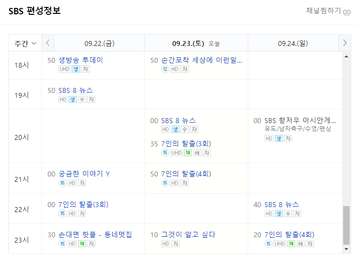 오늘 7인의 탈출 4화 예고가 나온 후 찾아본 것이 있습니다. 바로 SBS 편성표인데요. 왜냐하면 내일은 항저우 아시안 게임이 공식적으로 개막하는 날이기 때문입니다. 그렇기 때문에 많은 방송이 편성이 안 될 수도 있다고 생각했었는데, 개막식을 연인을 잠시 쉬고 있는 MBC에서 방영을 하네요! 그렇기 대문에 SBS에서는 7인의 탈출을 그대로 4화가 방영된다는 사실! 꼭 잊지 마셔요. 그리고 이번주는 개막식이니 중계를 굳이 하지 않아도 되지만, 다음주는 실제 경기들이 방영되는 시점에는 뉴스도 편성이 밀리고 하는 마당이기 때문에 7인의 탈출 5, 6화는 아시안 게임 일정으로 결방될 확률이 높습니다.